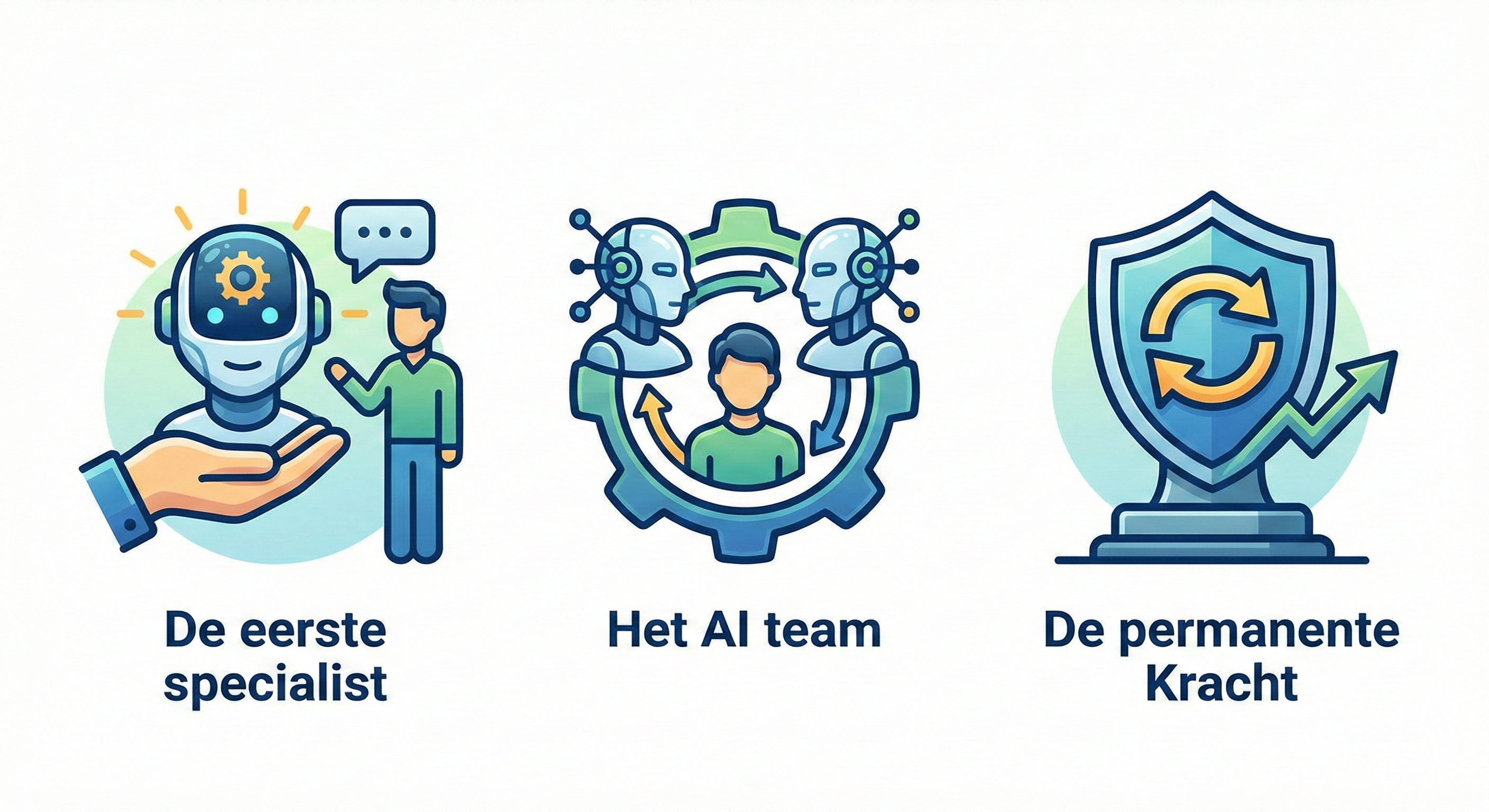 Wij bouwen geen losse tools, wij integreren nieuwe capaciteit. Wij zorgen dat AI niet alleen technisch werkt, maar ook sociaal landt in het team.